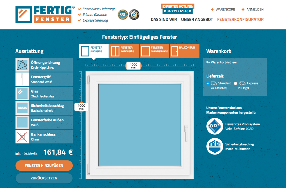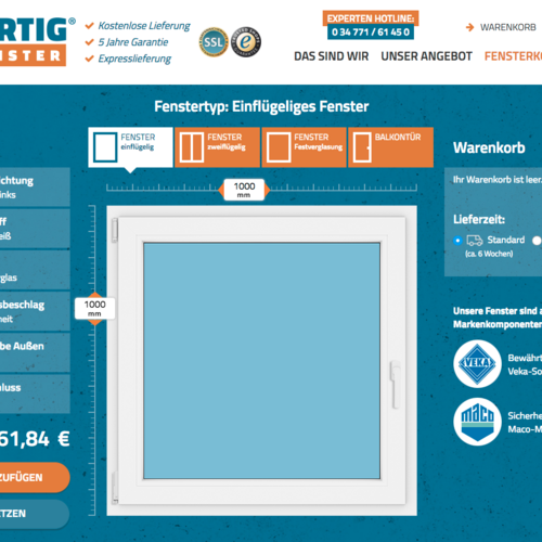 Čia klientai gali ytin lengvai sukonfiguruoti savo langus ar balkono duris, užsisakyti jų pristatymą tiesiai į namus ar į statybvietę visoje Vokietijoje, pageidavus - vos per 10 dienų. Taip pat čia galima užsisakyti reikiamų medžiagų montavimo darbams.